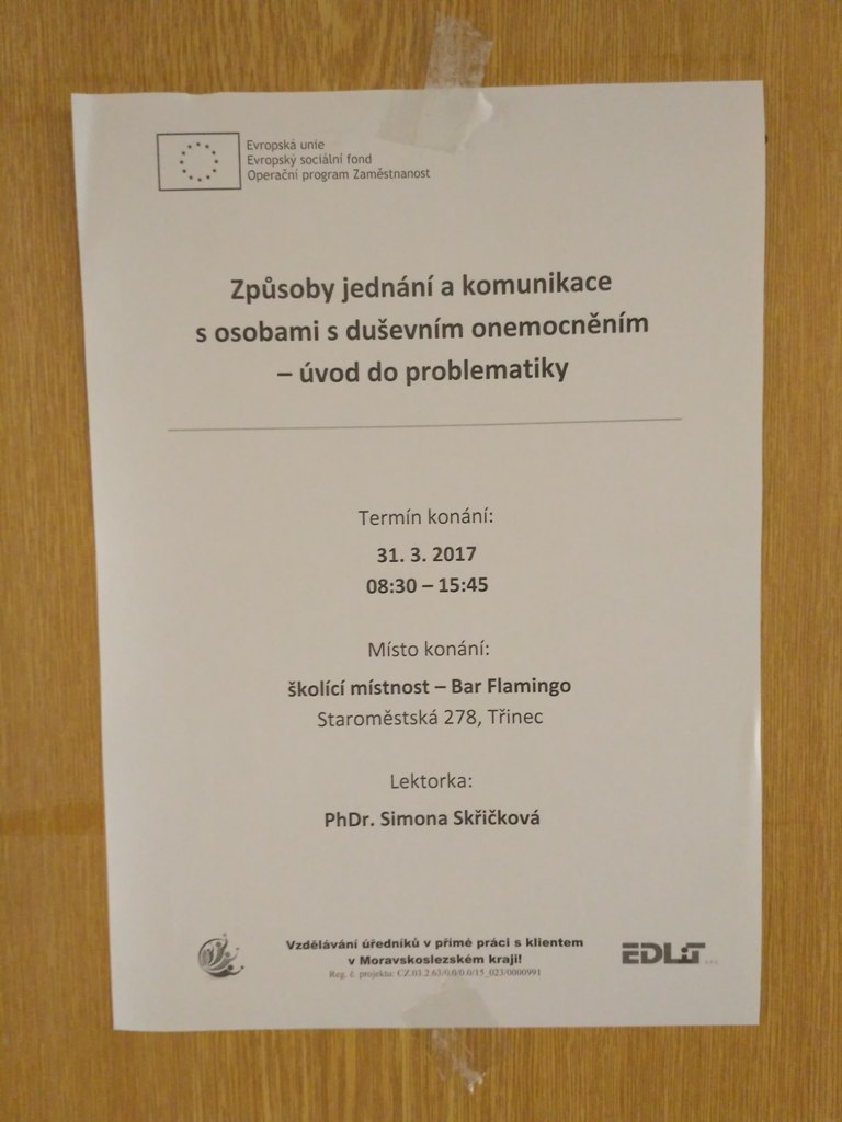 - Způsoby jednání a komunikace s osobami s duševním onemocněním - úvod do problematiky (v rozsahu 8 VH, akreditace MPSV)